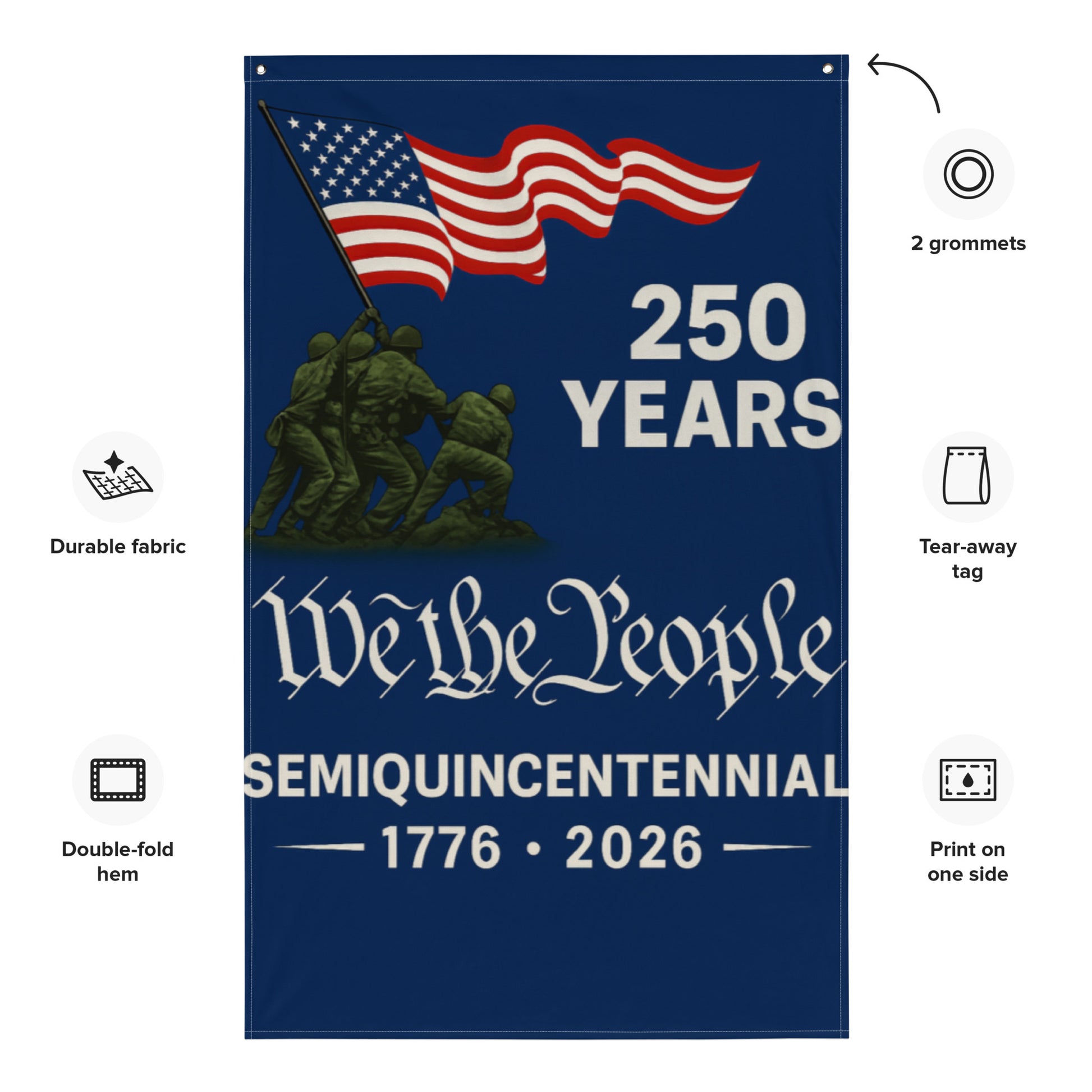 Patriotic Design – Bold commemorative text “250 YEARS – We the People – Semiquincentennial 1776–2026” with powerful imagery.